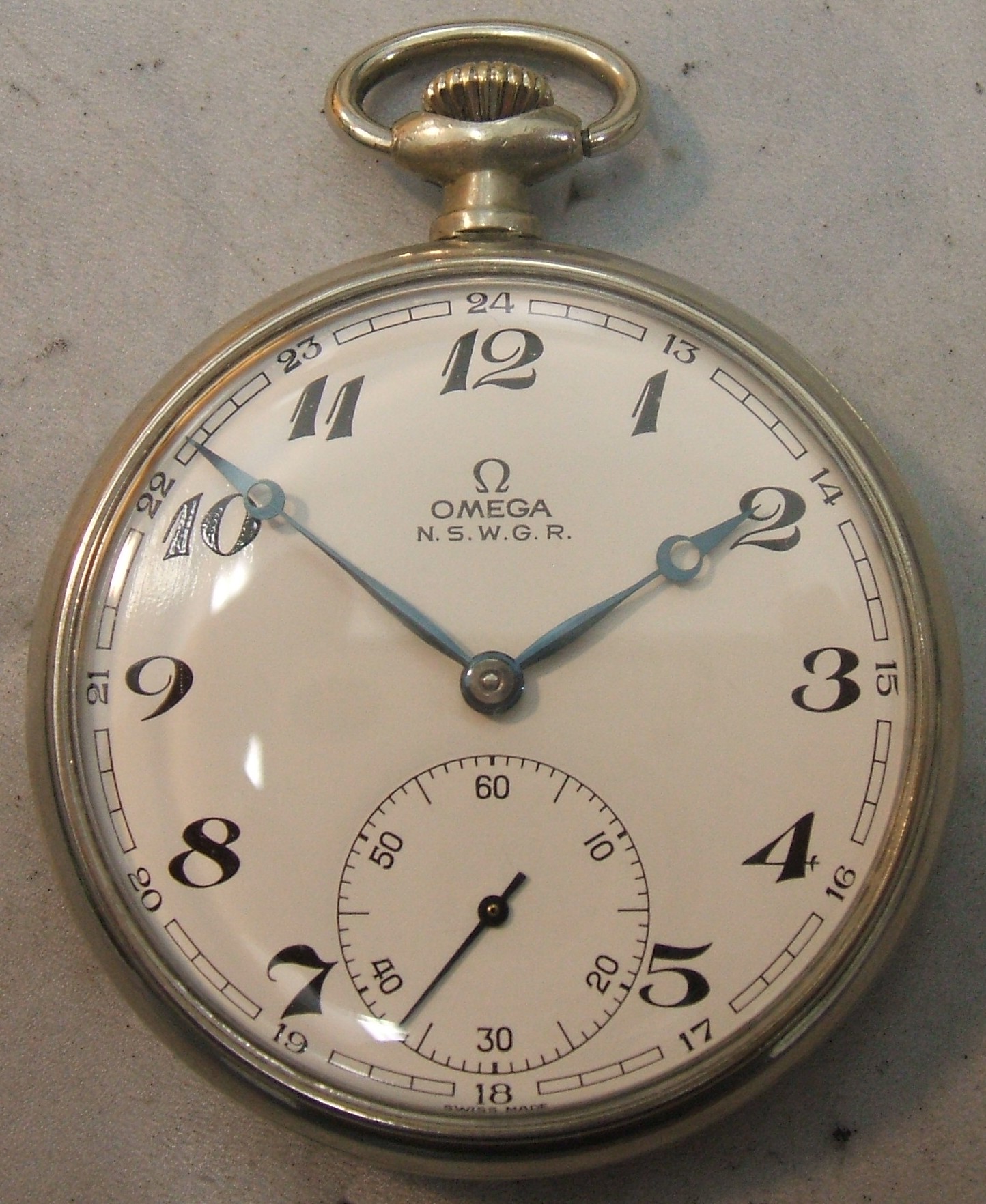 This is a former NSW Government railway watch (N.S.W.G.R printed on dial) with a GR 12006 engraved on the back.  The enamel dial is in perfect original condition with a slightly suncken sub second hand.  The numbers are so stylish as are the blue gunmetal hands.  I brought this for $100, replaced the glass, polished up the case, had the movement overhauled and the brocken balance staff replaced.  I love this watch