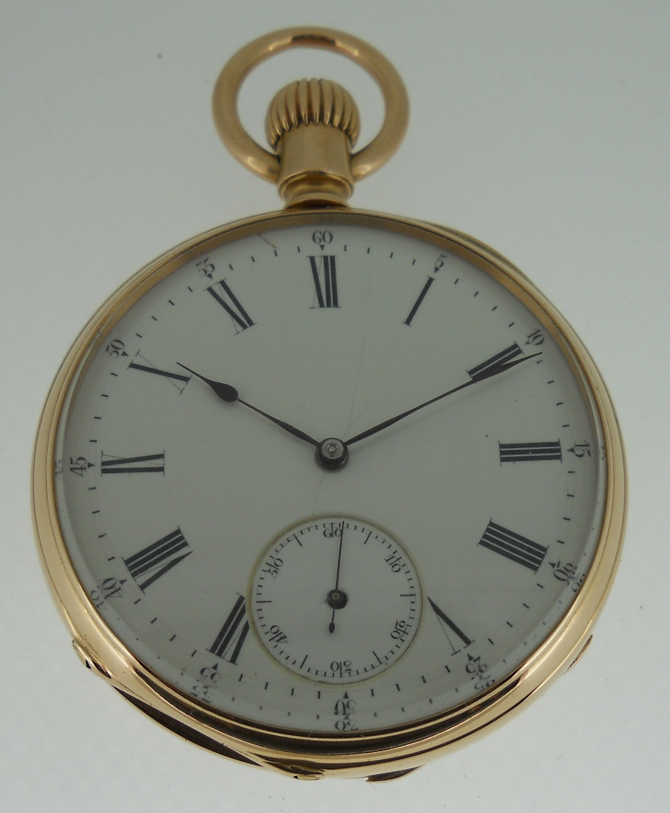 The 15 jewel movement with lever escapement is very plain; the watch is signed only on the inner case lid. The dial and hands are elegant but plain. A watchmaker examining this without noticing the signature would never pick this as product of one of the greatest watch manufactures of all time.