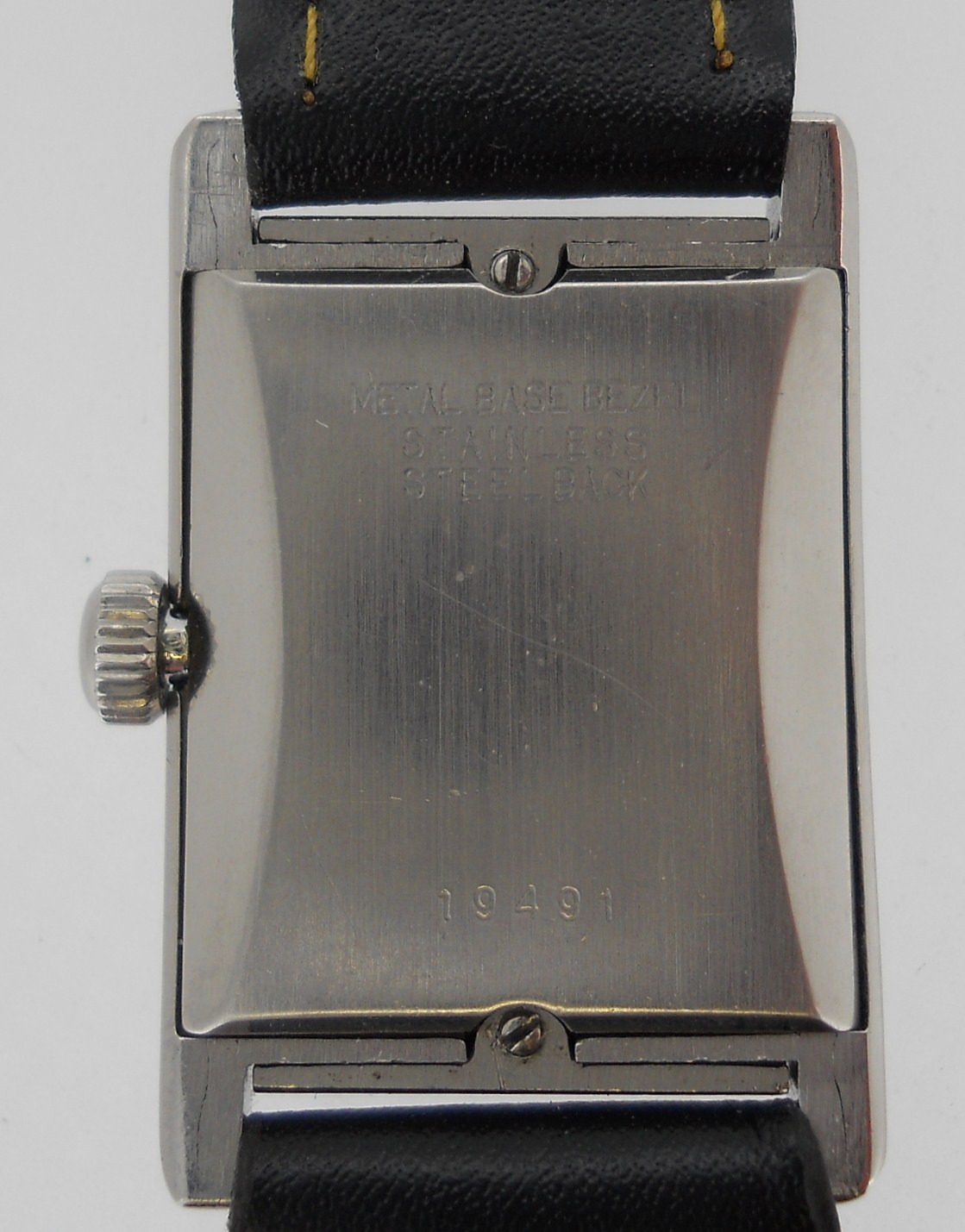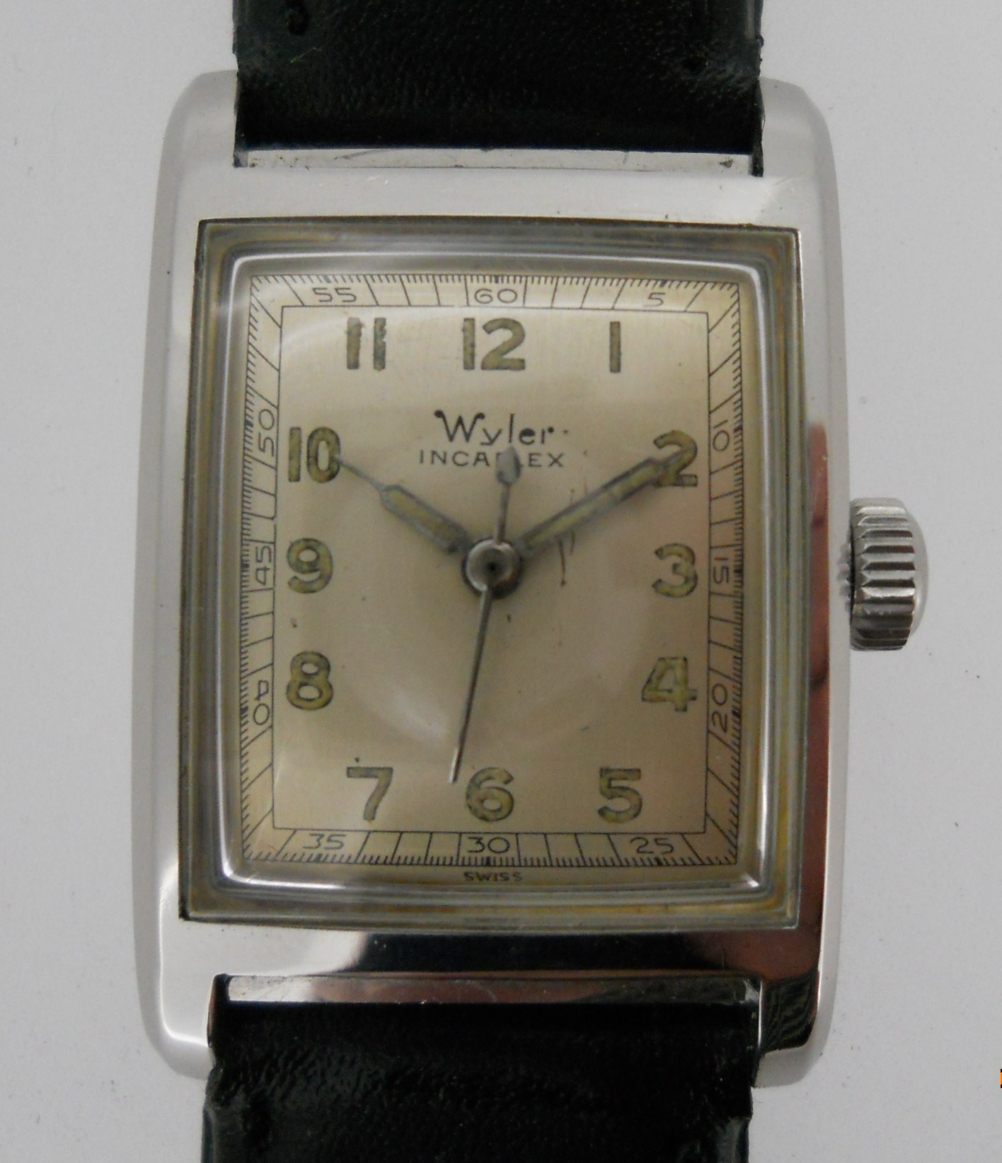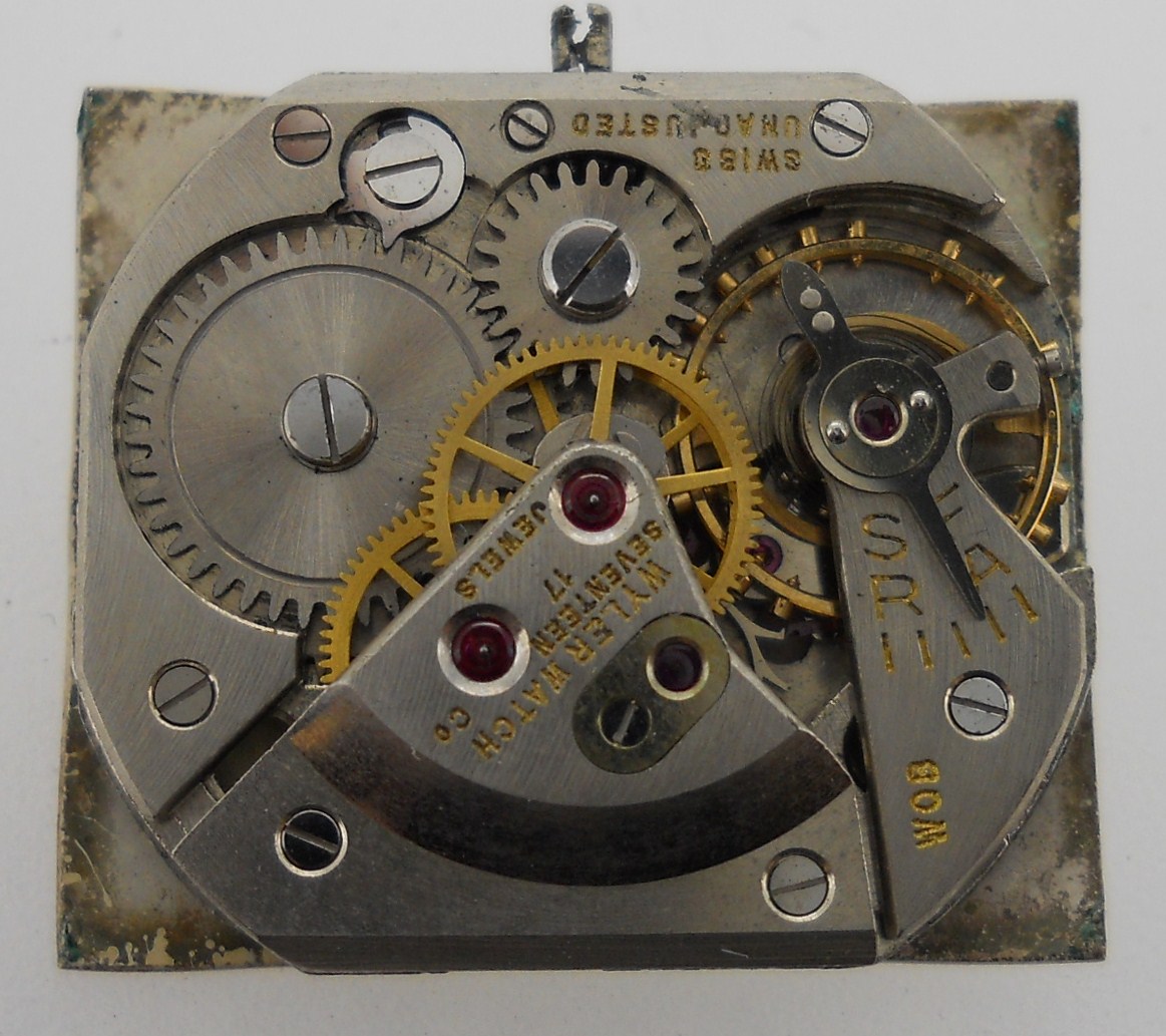 This Wyler from about 1950 was very advanced for the time. I don’t think I have another watch from this era that is water-resistant and shock protected and, surprisingly, this mid size watch is still quite dressy. The fashion of the forties and early fifties was small rectangular and that makes it even more difficult to make a watch water proof, but this watch achieves that.
