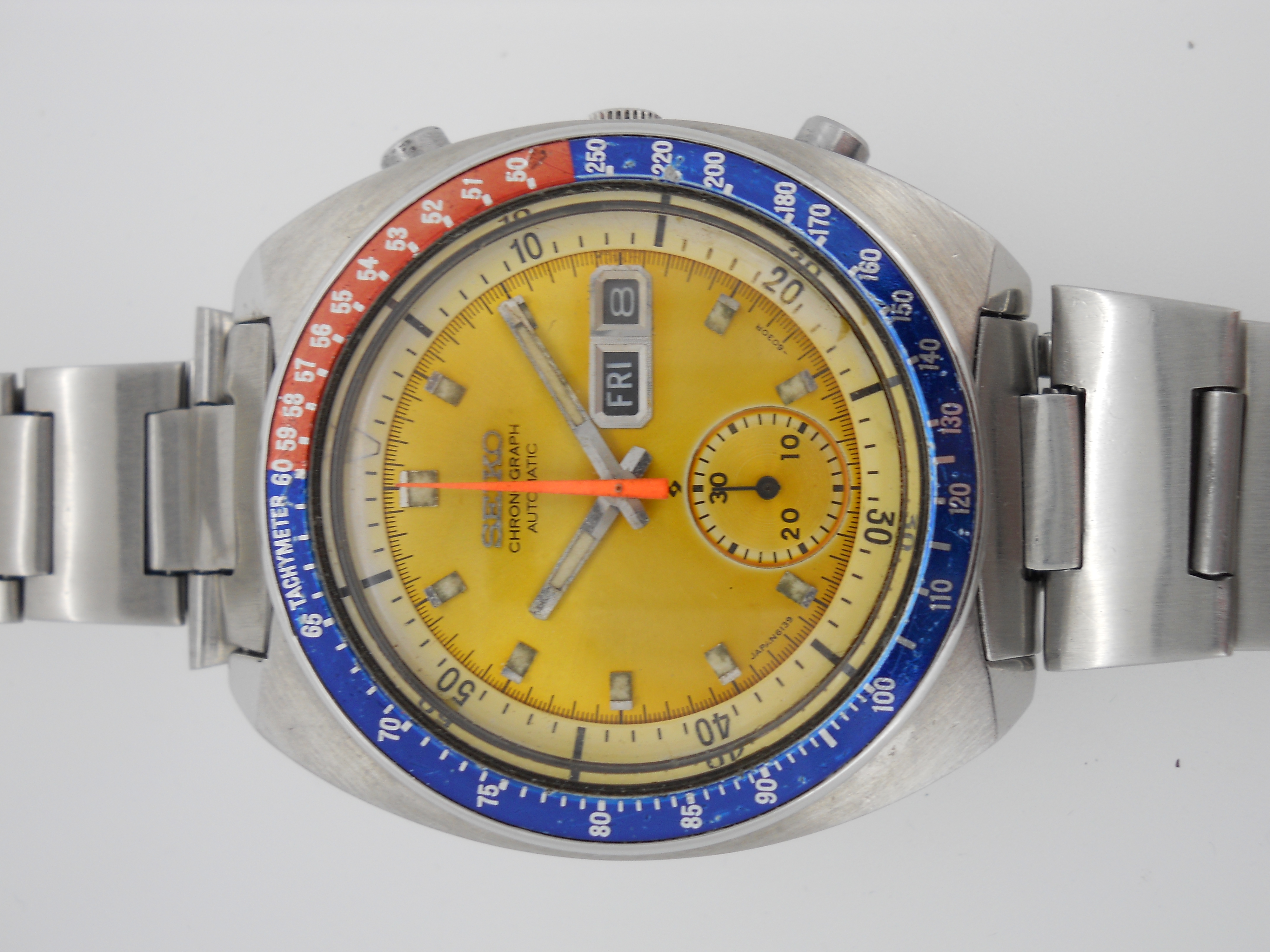 Nice bright yellow dial with equally bright red and blue bezel featuring a tachymeter scale and a rotating inner divers scale bezel. The rest is standard 6139 two register Chronograph.