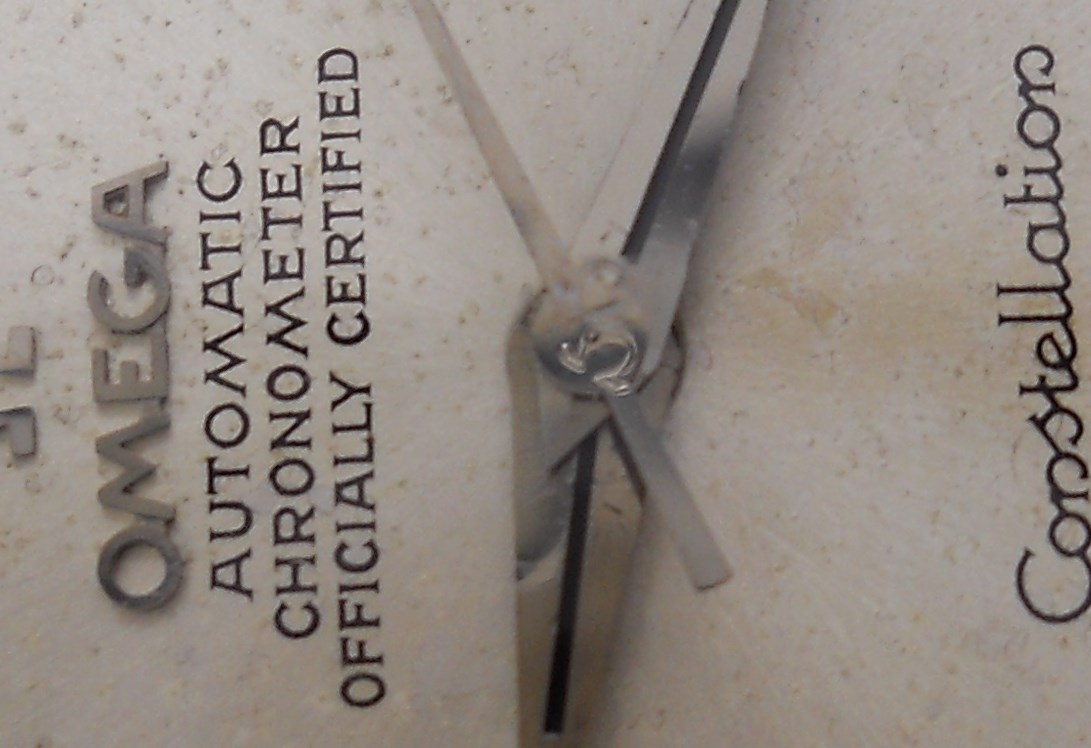 It is by no means a perfect example of a 1963 Constelation. The original dial is sadly aged and the movement seems to have suffered moisture damage because parts like the rotor have been buffed. It is all original, signed 5 times including a watermark logo in the centre of the perspex.