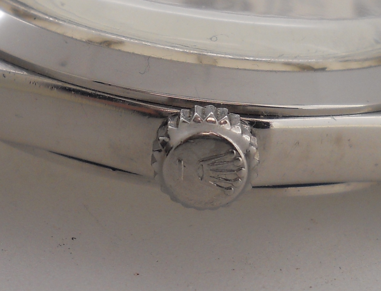 This model is classic Tudor, a 1966 model (twenty years into this young company’s history). It uses a basic Ebauche ETA 1100 manual wind movement, no date, housed in a Rolex Oyster case. And, like all Tudor Oysters it lets it be known loud and clear having “ORIGINAL CASE BY ROLEX GENEVA” etched into the back along with the Rolex crown emblem. The crown logo is also seen on the winding crown.