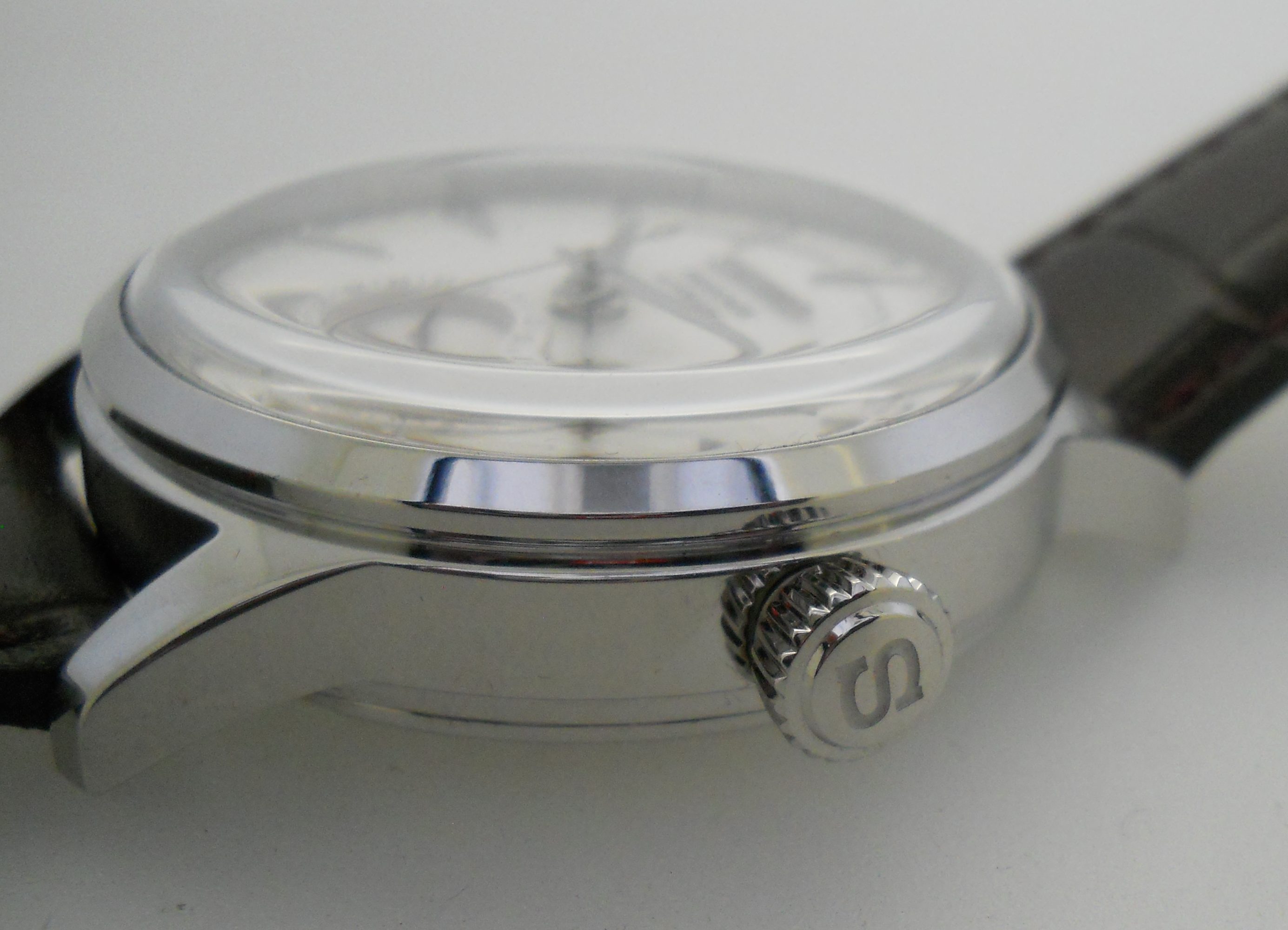 The dial is extremely eye-catching; subtly textured, three layer with a sunken date sub dial and raised index markers. The quality of the hands and markers is excellent mirror finish, in keeping with Seiko’s habit of over delivering on quality with the visual features. The delphin hands are bevelled, which gives this watch excellent legibility despite the rather poor contrast. The very large crown and the domed glass, not only gives this watch a retro look, but also a lot of character.