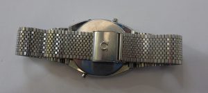Back to this watch; while most digitals focused on the sports watch market, this one is more on the dressy side. Being only 8mm thick it sits very nicely on the wrist and has a fine stainless steel mesh bracelet. It is water resistant to 30m and has only three buttons. It is signed four times; dial, module, inside the back and the clasp. Missing is a medallion on the case back as you would find on almost all Omegas of era, this back is completely plain.