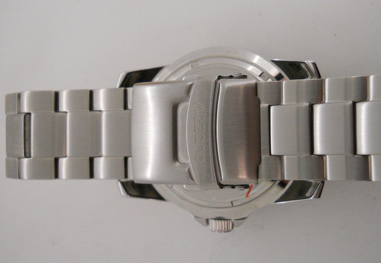 The glass in this watch is one thing that really impressed me, it’s 4mm thick. The back, a little less impressive but adequate at only 1.5mm thick. The bracelet is also impressive, solid stainless steel links rather than the cheaper folded stainless steel plates. The clasp is also well constructed with a spring loaded release mechanism and a safety clip that snaps into position with small spring loaded balls. The operational action of the clasp is what you would expect in a watch twice this price. The dial is large and clear with good contrast, can you get better than white on black? The hour hand is easily distinguished from the minute hand, the hour hand is broad arrow style while the minute hand is picket style. The good contrast extends to the bezel where the large dot is luminous.