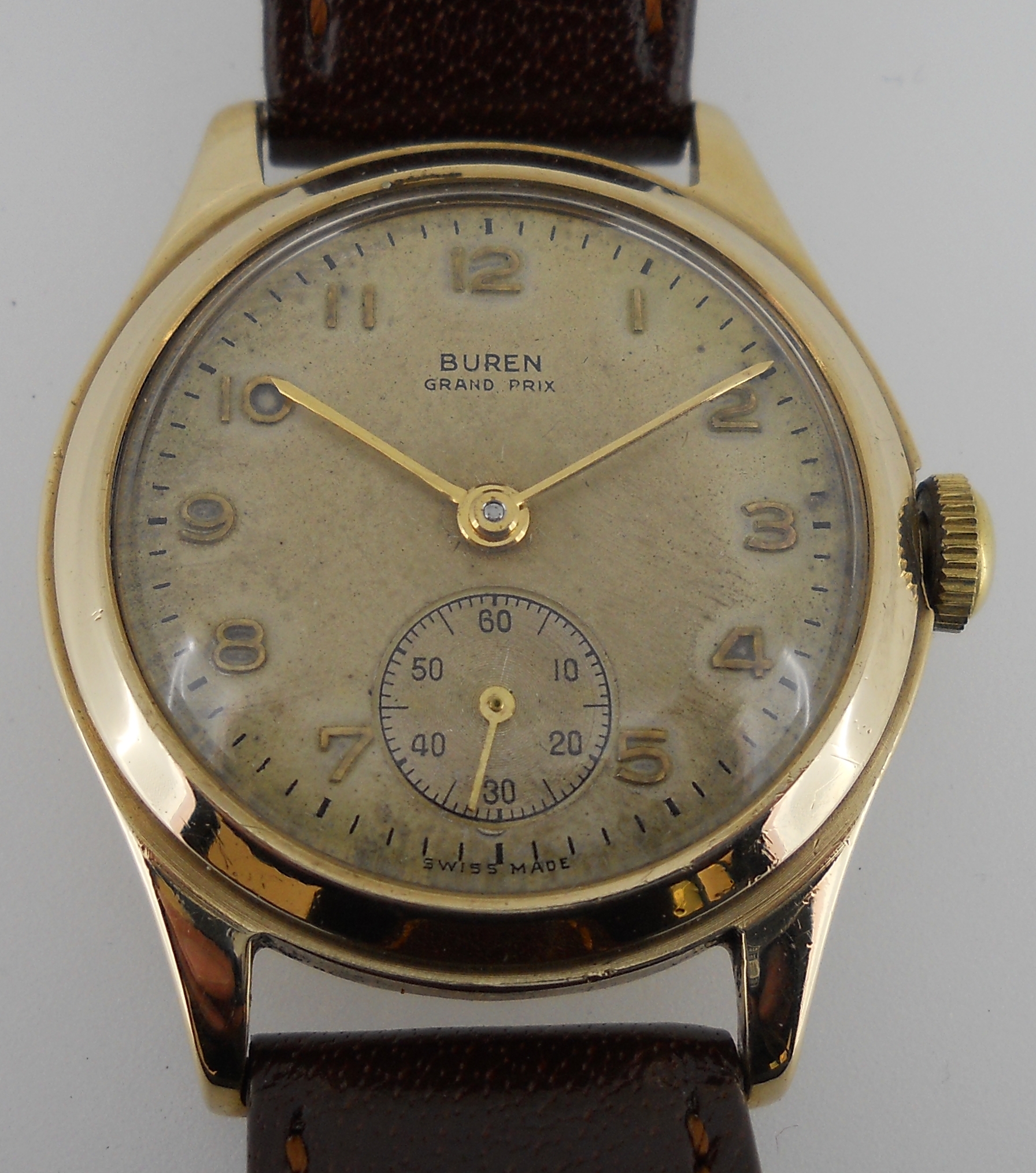 This is a 9ct gold Buren from the late forties. It’s in very good original condition with a heavily aged dial. If it was produced anytime after about 1960, it would be categorised as a dress watch but in the forties it was an ordinary, high-grade watch. The only advanced feature here is a sub second hand. It uses an in-house 410, well finished movement.